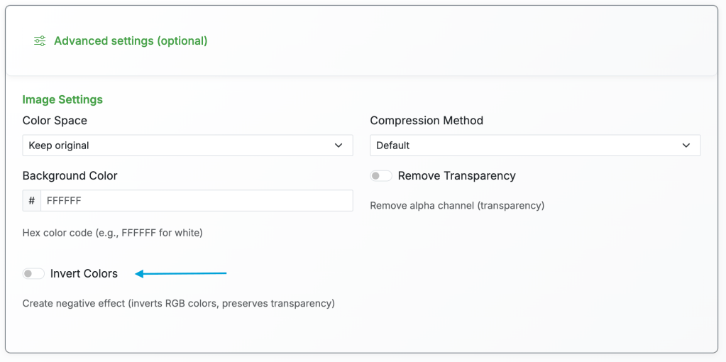 4. Enable “Invert Colors” – Look for the “Invert Colors” checkbox in the advanced options section and click it to enable the negate feature. You’ll see a description confirming it creates a negative effect while preserving transparency.